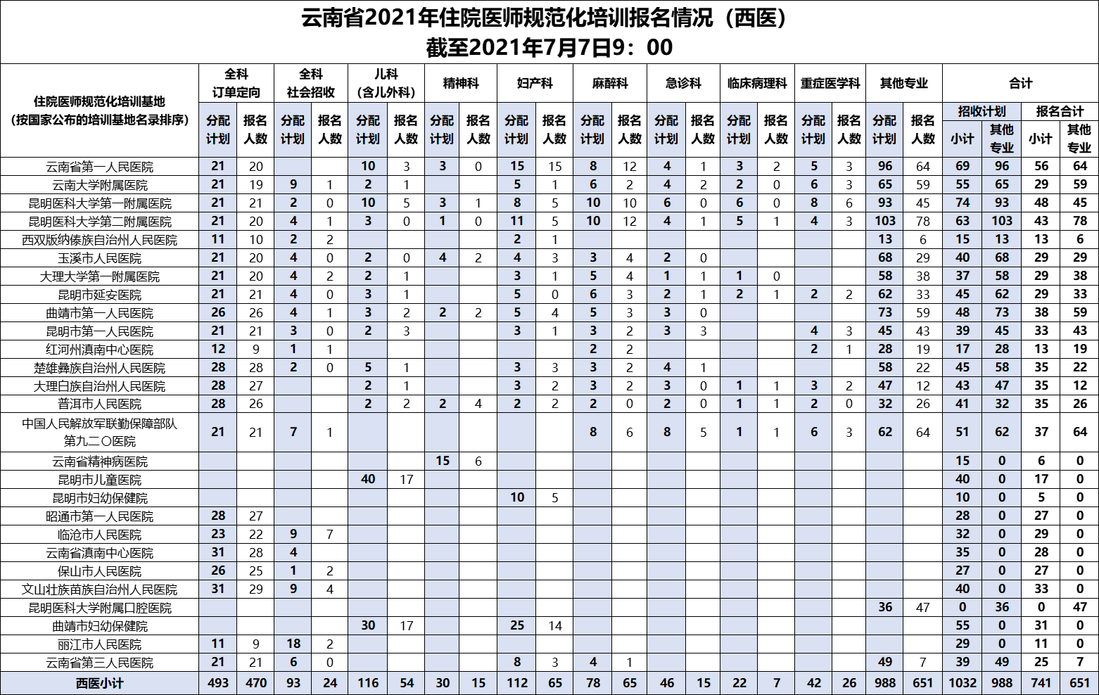 云南省2021年住院醫(yī)師規(guī)范化培訓(xùn)報(bào)名情況(西醫(yī))截至2021年7月7日9:00