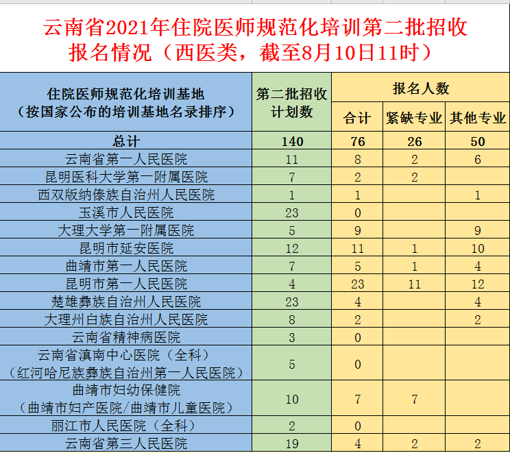 云南省2021年住院醫(yī)師規(guī)范化培訓(xùn)第二批招收?qǐng)?bào)名情況(西醫(yī)類(lèi),截至8月10日11時(shí))
