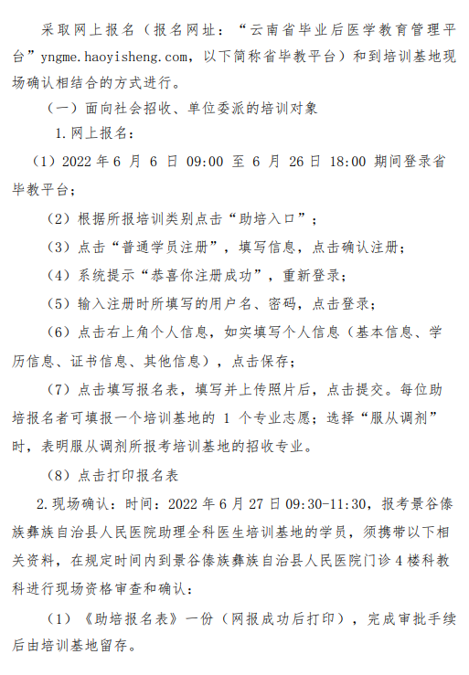 以上就是“云南景谷縣人民醫(yī)院助理全科醫(yī)生培訓(xùn)基地2022年招收簡章”的全部內(nèi)容,由醫(yī)學(xué)教育網(wǎng)小編整理,希望對您有所幫助!想要了解更多關(guān)于住院醫(yī)師規(guī)范化培訓(xùn)考試相關(guān)政策,請繼續(xù)關(guān)注此欄目!