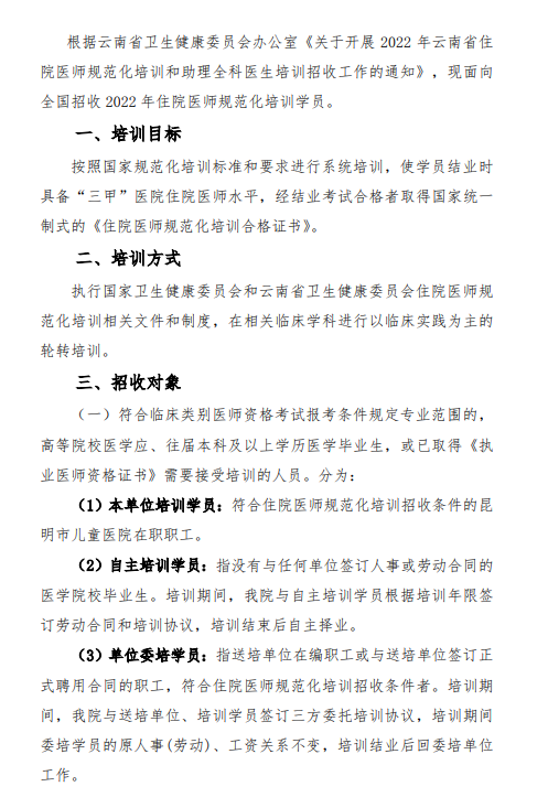 相關(guān)附件:昆明市兒童醫(yī)院2022年住院醫(yī)師規(guī)范化培訓(xùn)招收簡章