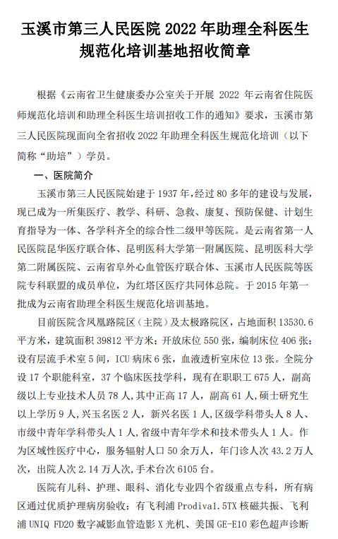 相關(guān)附件:玉溪市第三人民醫(yī)院2022年助理全科醫(yī)生規(guī)范化培訓(xùn)基地招收簡(jiǎn)章
