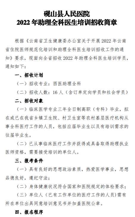 相關附件:云南硯山縣人民醫(yī)院2022年助理全科醫(yī)生培訓招生簡章