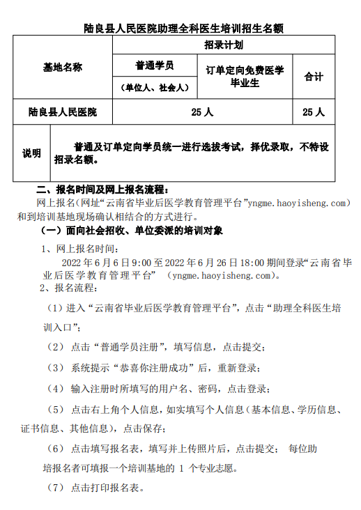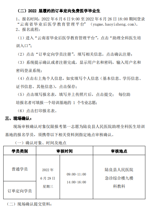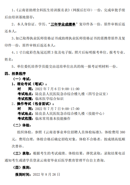 以上就是“云南陸良縣人民醫(yī)院2022年助培招生簡章”的全部內(nèi)容,由醫(yī)學(xué)教育網(wǎng)小編整理,希望對您有所幫助!想要了解更多關(guān)于住院醫(yī)師規(guī)范化培訓(xùn)考試相關(guān)政策,請繼續(xù)關(guān)注此欄目!