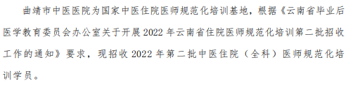 各位考友請(qǐng)注意!曲靖市中醫(yī)醫(yī)院 2022 年中醫(yī)住院(全科)醫(yī)師規(guī)范化培訓(xùn)基地第二批招收簡(jiǎn)章公布!為了讓大家及時(shí)了解當(dāng)?shù)?a href="http://www.tymfj.cn/zhuyuanyishi/" target="_blank" title="住院醫(yī)師" class="hotLink">住院醫(yī)師規(guī)范化培訓(xùn)通知內(nèi)容,醫(yī)學(xué)教育網(wǎng)小編整理官方通知分享如下: