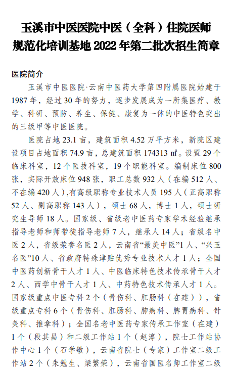 各位考友請注意!玉溪市中醫(yī)醫(yī)院中醫(yī)(全科)住院醫(yī)師規(guī)范化培訓基地2022年第二批次招生簡章公布!為了讓大家及時了解當?shù)?a href="http://www.tymfj.cn/zhuyuanyishi/" target="_blank" title="住院醫(yī)師" class="hotLink">住院醫(yī)師規(guī)范化培訓通知內(nèi)容,醫(yī)學教育網(wǎng)小編整理官方通知分享如下: