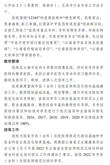以上就是“玉溪市中醫(yī)醫(yī)院中醫(yī)(全科)住院醫(yī)師規(guī)范化培訓基地2022年第二批次招生簡章”的全部內(nèi)容,由醫(yī)學教育網(wǎng)小編整理,希望對您有所幫助!想要了解更多關于住院醫(yī)師規(guī)范化培訓考試相關政策,請繼續(xù)關注此欄目!