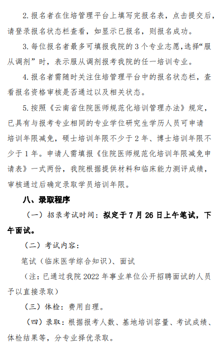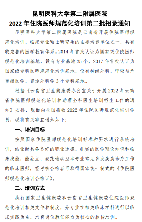 昆明醫(yī)科大學(xué)第二附屬醫(yī)院2022年住院醫(yī)師規(guī)范化培訓(xùn)第二批招錄通知公布!為了讓大家及時(shí)了解當(dāng)?shù)?a href="http://www.tymfj.cn/zhuyuanyishi/" target="_blank" title="住院醫(yī)師" class="hotLink">住院醫(yī)師規(guī)范化培訓(xùn)通知內(nèi)容,醫(yī)學(xué)教育網(wǎng)小編整理官方通知分享如下:
