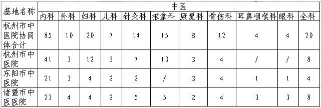 2019年上級部門下達(dá)杭州市協(xié)同體中醫(yī)住院醫(yī)師規(guī)范化培訓(xùn)招錄計劃199人,其中我院91人,東陽市中醫(yī)院45人,諸暨市中醫(yī)醫(yī)院63人。協(xié)同體內(nèi)各專業(yè)基地招生規(guī)模如下: